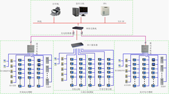 針對傳染病房配電室、醫療綜合樓配電房距離行政后勤樓較遠,底層監控裝置具備RS485接口,網絡通訊介質采用屏蔽雙絞線,通訊協議采用Modbus通訊規約,通過RS485總線方式將數據傳送至以太網關;上層網絡通訊介質采用光纖傳輸,通訊管理機將采集的數據經處理后經光纖收發器和光纜上傳至行政后勤總變室內光線收發器,再經超五類線的以太網信號將數據長傳至監控主機。行政后勤樓內的中央空調分配在總變附近,中央空調配電室監控裝置具備RS485通訊接口,網絡介質采用屏蔽雙絞線,通訊協議采用Modbus通訊規約,通過RS485總線方式將數據傳送至總配的通訊管理機,上層通訊介質使用超五類線,通訊管理機將采集的數據處理后經TCP/IP協議的網絡信號上傳至總配值班室監控主機。