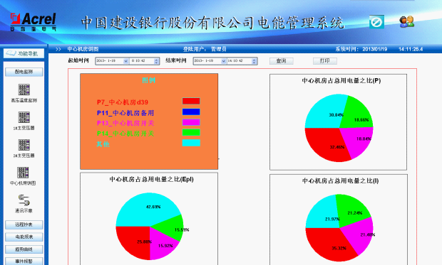 v 客戶對報表的要求:對各回路的電流、電壓、功率、功率因數、2-31各次諧波分量、相間溫度℃,發(fā)電機房和配電室溫濕度做相應的報表并支持查詢歷史數據打印功能,用餅圖的形式顯示四個中心機房的負載率。