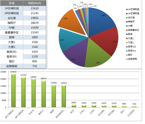 通過系統可在線收集電能審計第一手數據資料,科學準確審計空調、照明、客房、廚房等功能區域的能耗,并自動計算公布企業的日、周、月、季、年的能耗指標和資料。另外,可以根據電能污染情況和酒店產值計算編制清潔能耗和GDP能耗公告。