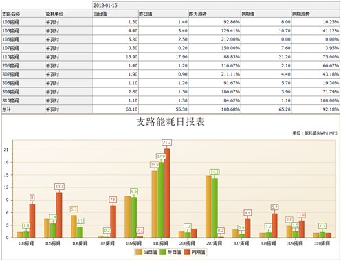 系統提供詳細的電能報表統計功能,對各用電回路在各時間段內用電量進行詳細的統計,并進行同比環比分析,與當日營業額、環境溫濕度等進行比較分析。