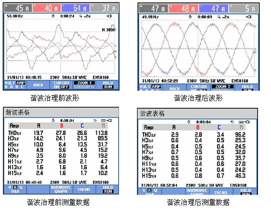 下面以1#ANAPF有源濾波器投入運行前、后配電系統電能質量測試情況的對比分析為例來具體描述,其中1#變壓器負載主要為燈光照明、電梯、潛污泵、計算機中心等。