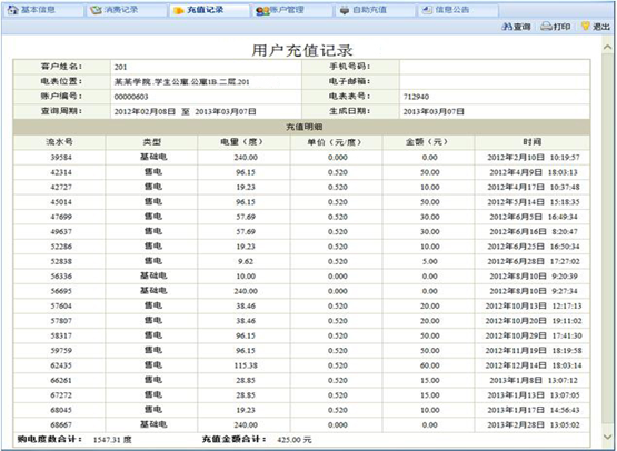 充值記錄查詢:管理記錄對預付費電表的充值記錄。能方便的查詢充值金額、充值時間等信息。