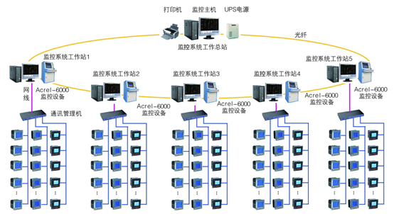 作為洲際大賽的開閉幕式會場,其對供配電系統的穩定性,安全性要求極高。因此,在每個綜合變配區域設置一個漏電火災監控系統工作站,實現對本變配電房各運行設備的運行狀態的檢測、預警,故障分析、統計輸出及被保護電氣線路的報警、監視、控制及管理。在看臺設備監控中心設一個中央控制室,系統服務器和主管理工作站設于該中央控制室,所有變配電房電力參數通過光纖傳輸至中央控制室。