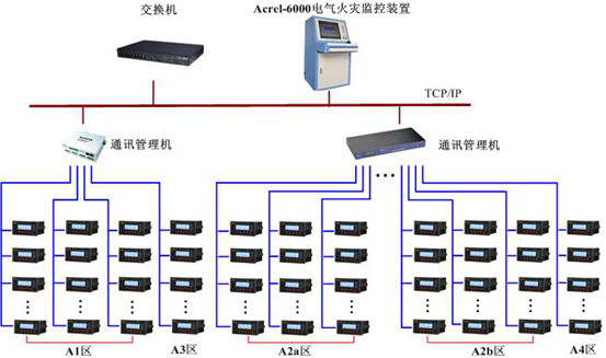 電氣火災監控系統(由電氣火災監控設備、剩余電流式電氣火災監控探測器、測溫式電氣火災監控探測器三部分組合而成)主要解決的是對電氣火災的預防和控制。隔離故障線路,重要性質負荷線路報警等。不包括對人身安全的直接及間接接觸電擊防護功能。系統采用HUB (集線器)星形結構布線,總線采用超五類8芯UTP(非屏蔽雙絞線),與火災自動報警系統分開且獨立敷設,因此其和火災自動報警系統為并列關系.也可成為火災自動報警系統的一個子系統。僅僅實時提供火災監控探測器對配電線路、配電設備和大型用電設備所監測的數據采集和傳輸。