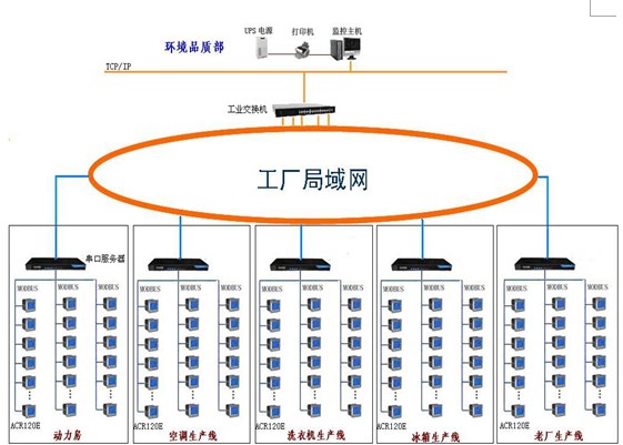 整個系統(tǒng)采用網(wǎng)絡(luò)分布式結(jié)構(gòu),監(jiān)控主機位于辦公樓二樓的環(huán)境品質(zhì)檢測部,數(shù)據(jù)采集主要劃分為三個區(qū),洗衣機生產(chǎn)回路設(shè)備、冰箱生產(chǎn)回路設(shè)備和老廠空調(diào)生產(chǎn)回路設(shè)備。電力儀表的通訊為485總線結(jié)構(gòu),將信號通過屏蔽雙絞線傳輸?shù)綌?shù)據(jù)采集器,數(shù)據(jù)采集器連入廠區(qū)的局域網(wǎng)中。