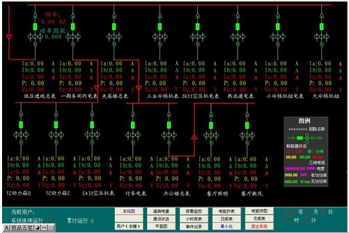 登錄普通權(quán)限用戶,通過主界面的操作,可以查看各回路運行的電參量(電流、電壓、有功、無功、功率因數(shù)、電度);登錄最高權(quán)限用戶,可以實現(xiàn)系統(tǒng)內(nèi)部電度報表、電流曲線、報警信息的打印及導出功能。