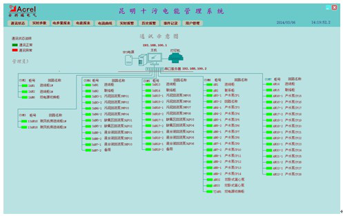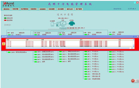 根據(jù)用戶需求,需要對(duì)第十污水處理廠6個(gè)變配電所進(jìn)行組網(wǎng)并建立電能管理系統(tǒng)(主要是數(shù)據(jù)的實(shí)時(shí)監(jiān)控),在控制中心值班室內(nèi)設(shè)置監(jiān)控平臺(tái),對(duì)97個(gè)回路實(shí)時(shí)監(jiān)測(cè)、統(tǒng)計(jì)、分析,以保證用電的安全、可靠和高效。