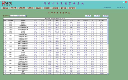 參數(shù)抄表功能,主要所有回路的電參數(shù)進(jìn)線查詢。支持任意時(shí)刻電參數(shù)查詢,具備數(shù)據(jù)導(dǎo)出和報(bào)表打印等功能。電參數(shù)主要包括:三相電壓、三相電流、有功功率、無(wú)功功率、頻率和有功電度。如圖(6)所示。