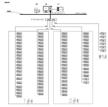 本系統(tǒng)采用分層分布式結(jié)構(gòu)進行設(shè)計,即站控管理層、網(wǎng)絡(luò)通訊層和現(xiàn)場設(shè)備層,項目組網(wǎng)圖如下,現(xiàn)場66個低壓回路的多功能網(wǎng)絡(luò)電力儀表和6塊燃氣表經(jīng)RS485現(xiàn)場總線連接至串口服務(wù)器,然后通過以太網(wǎng)傳輸至現(xiàn)場監(jiān)控主機,實現(xiàn)數(shù)據(jù)的采集,存儲,處理,顯示和上傳如圖(1)所示: