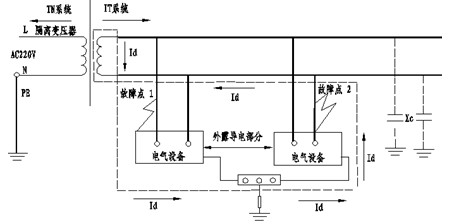1.《民范》14.2.1.3對IT系統是這樣闡述的:電力系統的帶電部分與大地間無直接連接(或有一點經足夠大的阻抗接地),受電設備的外露可導電部分通過保護線接至接地極。