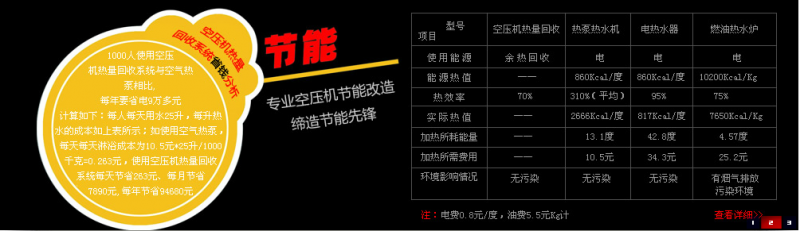 我司自主研發的利用空壓機壓縮空氣的熱量供員工生活用水的空壓機節能熱水項目在東莞已經取得了好的成績,在茶山,樟木頭,橫瀝等鎮區都安裝了樣板工程,為客戶節約了大量的資金.讓顧客不再為空壓機高溫,員工生活熱水耗電而煩惱.