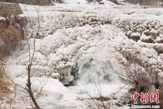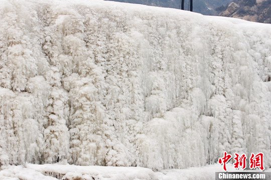 17日,盡管春季已到,但在山西省交城縣大山里,卻不現一絲春意,在順流而下的幾十里的河谷里,河水凝固成千姿百態的冰柱、冰幔、珍珠灘。那些牢牢凍在石壁之上的山泉飛瀑形成的層層疊疊、錯落有致的巨大冰瀑。