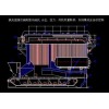是一種臥式三回程水火管混合式鍋爐,在鍋筒內(nèi)布置一束螺紋煙管。爐膛左右二側(cè)裝有光管水冷墻。采用輕型鏈條爐排實(shí)現(xiàn)機(jī)械加煤,配有鼓風(fēng)機(jī)、引風(fēng)機(jī)進(jìn)行機(jī)械通風(fēng),并裝有刮板式出渣機(jī)實(shí)現(xiàn)自動(dòng)出渣。該爐前后拱采用新型的節(jié)能技術(shù)爐拱。燃料自煤斗落到爐排上,進(jìn)入爐膛燃燒后,火焰經(jīng)過(guò)后拱折射向上通過(guò)本體兩側(cè)燃燼室折向轉(zhuǎn)到前煙箱,再由前煙箱折回鍋內(nèi)管束,通過(guò)后煙箱進(jìn)入省煤器,然后由引風(fēng)機(jī)抽引通過(guò)煙道至煙囪排向大氣。