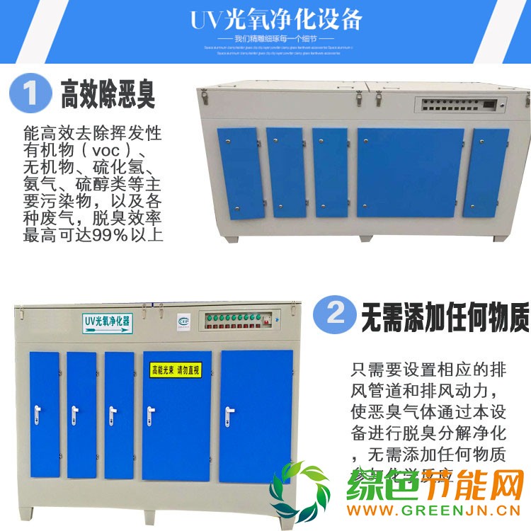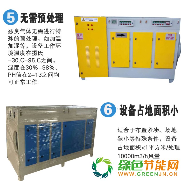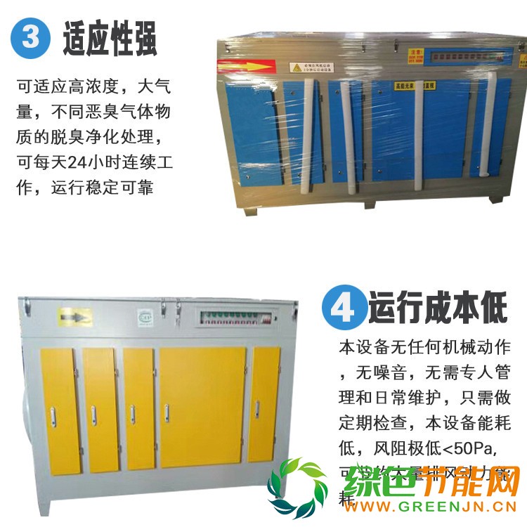?、?、無需添加任何物質:只需要設置相應的排風管道和排風動力,使惡臭/工業廢氣通過本設備進行脫臭分解凈化,無需添加任何物質參與化學反應。UV光解廢氣凈化設備可適應高濃度,大氣量,不同工業廢氣物質的脫臭、凈化處理,可每天24小時連續工作,運行穩定可靠。UV高效光解廢氣凈化設備無任何機械動作,無噪音,無需專人管理和日常維護,只需作定期檢查,本設備能耗低,設備風阻極低<50pa,可節約大量排風動力能耗。