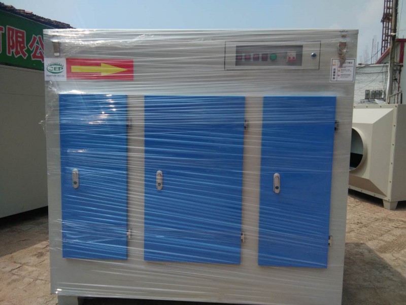 三、惡臭氣體利用排風設備輸入到本凈化設備后,凈化設備運用高能UV紫外線光束及臭氧對惡臭氣體進行協同分解氧化反應,使惡臭氣體物質其降解轉化成低分子化合物、水和二氧化碳,再通過排風管道排出室外。