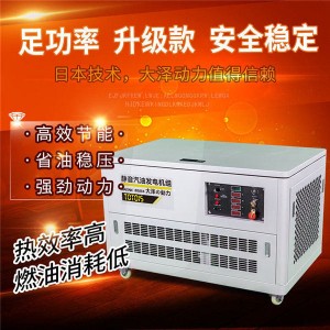 靜音15kw汽油發電機TOTO15大澤發動機具有體積小、重量輕、油耗低、功率高、工作可靠,配件供應及維修方便。采用電子調速器,具有冷卻水溫過高、機油壓力低及警告并自動停車等保護功能。大澤動力汽油發電機引入 產的同時也衍生了發電機變頻和靜音版,這兩款同樣來自于大澤動力。,而隨著中 的發電機消費市場越來越趨向于小眾型 用型,我們可以預想的是靜音和變頻版也將會擁有自己的市場。