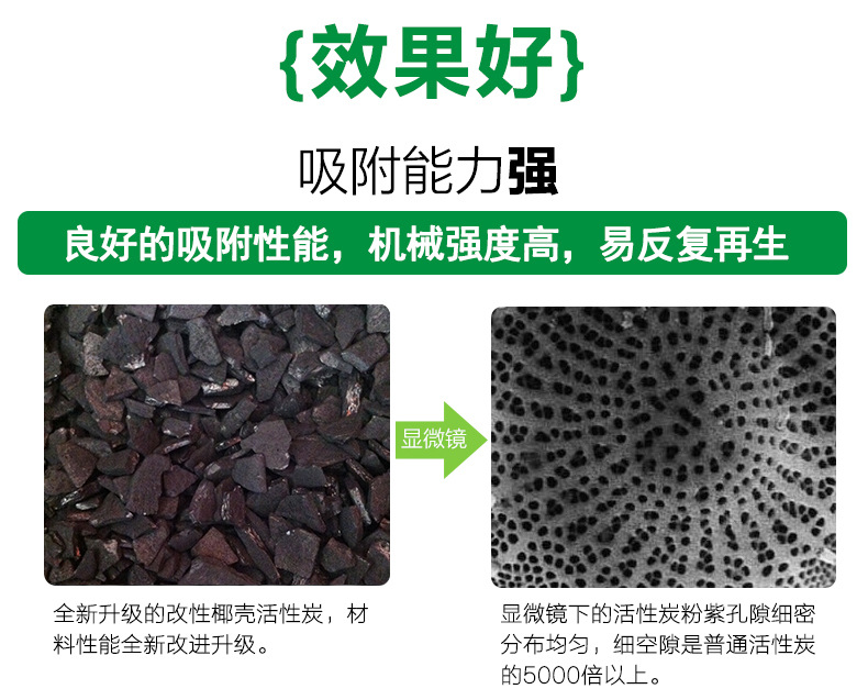 產品具有發達的孔隙結構,比表面積大,吸附能力強,機械強度高,純度高等特點。主要用于飲用水、酒類、飲料等原料用水的凈化處理,亦可用于電鍍液中有機和無機物有害雜質的去除,對凈化飲用水有極好的效能,它不但能除去異臭異味,提高色度而且對水中的各種雜質如氯、酚、汞、鉛、砷、洗滌劑、農藥等有毒有害物質有很高的去除率,是裝填家庭賓館及高級凈水生產設備的理想材料。