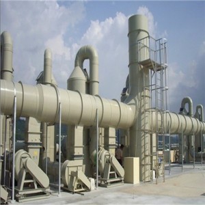 氣體由離心通風機壓入或吸入進風段,再流動至填料層,與噴淋液接觸反應。根據氣體凈化情況等各項指標,可以加裝第二級填料及噴淋裝置,處理凈化后的氣體通過除霧器排出。該洗滌塔凈化效率高達95%,阻力損失小能耗低,操作穩定可靠適用范圍廣。