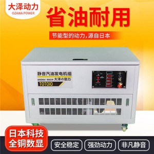 可移動靜音12千瓦汽油發(fā)電機優(yōu)點:功率大,耗油低,節(jié)油控油,價格合理,質(zhì)量過關,擁有各項證書,可檢驗,中意技術研究生產(chǎn),長期與中鐵工程公司,山東海洋工程,,全自動發(fā)電機斷電自動投入啟動運行。適用于野外作業(yè)和機動作業(yè)。輪式底盤帶牽引裝置,可隨時移動及調(diào)節(jié)平衡。尾部自帶警示燈,轉(zhuǎn)向燈,符合交通行駛要求。大澤動力系列發(fā)電機,操作簡便、運轉(zhuǎn)寧靜、技術、耐久耐用,以其特殊高品質(zhì)的電源,廣泛用于工農(nóng)業(yè)和通訊網(wǎng)絡系統(tǒng)、銀行、金融、電腦產(chǎn)品及UPS配套。