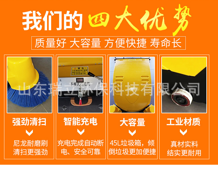 ★手推式吸塵掃地機設計精巧輕便,環保經濟實用,強勁的清掃系統和高效吸塵,過濾系統使垃圾一掃而光。無需專業操作人員。