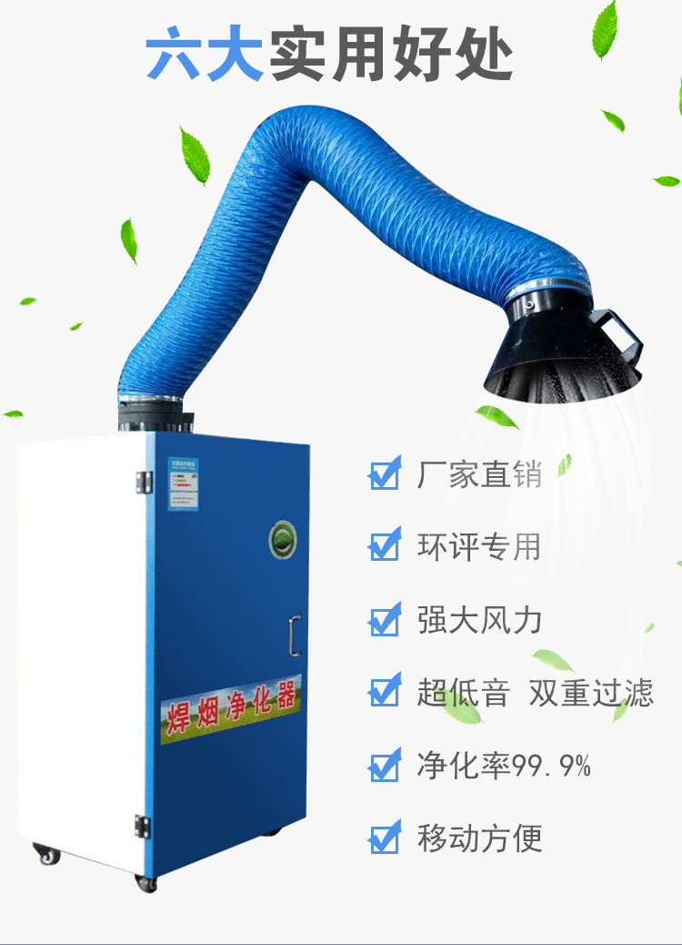 3.吸氣罩可以隨著吸氣臂一起伸展到任何想要到達的位置、它可以配備柔性吸氣臂或兩個柔性吸氣臂、吸氣臂可360度隨意活動、可從煙氣發生出吸除煙氣、大大提高了煙氣的收集率、保證了工作人員的健康。