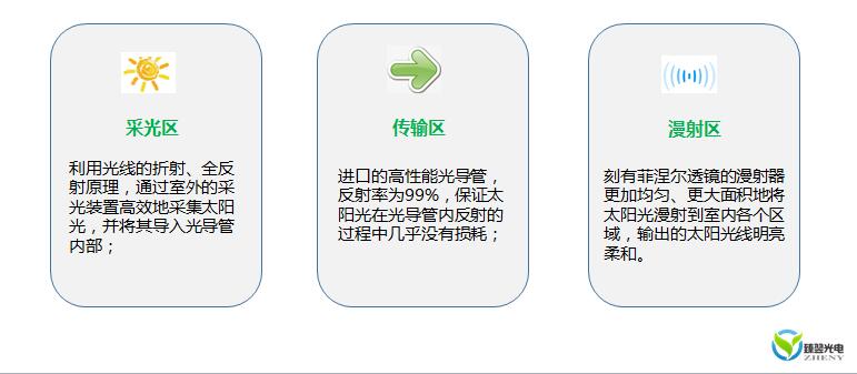 一套光導照明標準組件包括:采光罩,防雨器、導光管(標準長度為625mm),防雨器,漫射器等主要部件組成。