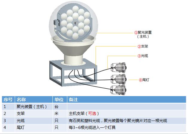 光纖陽光照明系統主要包括:聚光裝置(主機)、光纜、尾燈三個部分組成。