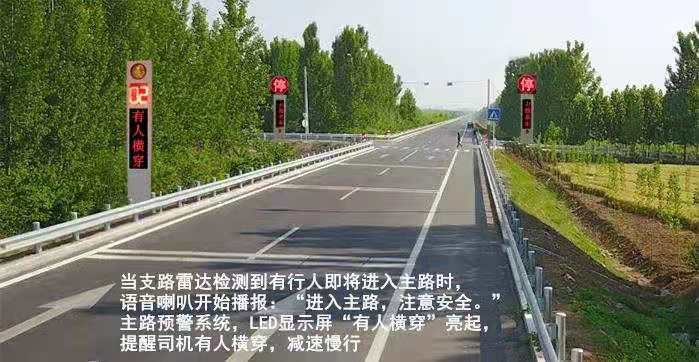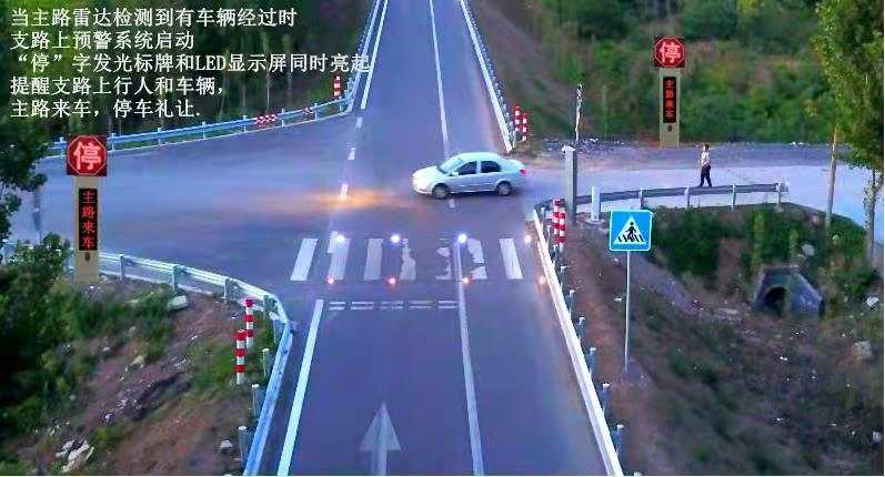 (3)主道設備與輔道發光警示功能:系統檢測到有車輛通過該區域時,自動點亮主道與輔道標識與語音播報功能,提示和引導車輛減速安全行駛;