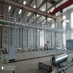 伸縮移動式前室工作流程:伸縮前室收縮合攏 工件移動就位 伸縮前室展開罩住工件 工件噴漆 伸縮前室收縮合攏 工件移出噴漆場。