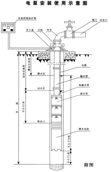 b) . 水泵進(jìn)水口必須在動(dòng)水位1米位以下,但潛水不得超過(guò)靜水位以下70米,電機(jī)下端距井底水深在1米以上。