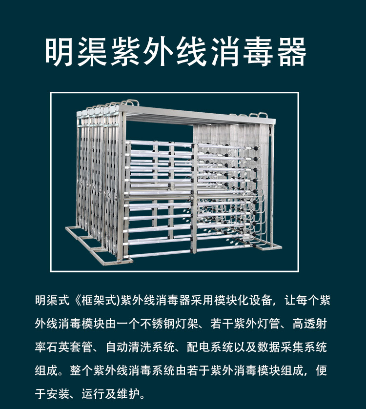 2、框架式紫外線消毒器用于渠道式排水的消毒處理。