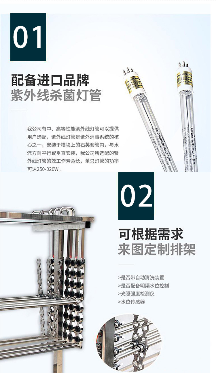 3、框架式紫外線消毒器可用于替代常規的加氯消毒工藝設備。紫外線消毒模塊:放置于水渠內,將燈管全部沒于水下作業。