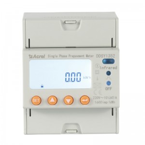 安科瑞DDSY1352系列預付費電表,有DDSY1352-RF,DDSY1352-NK,DDSY1352-Z三種型號,可以進行單相電參量的測量,支持費控,時控,負控,支持射頻卡充值,配合斷路器實現負載斷電,,有功電能精度1級,1路RS485通訊接口。