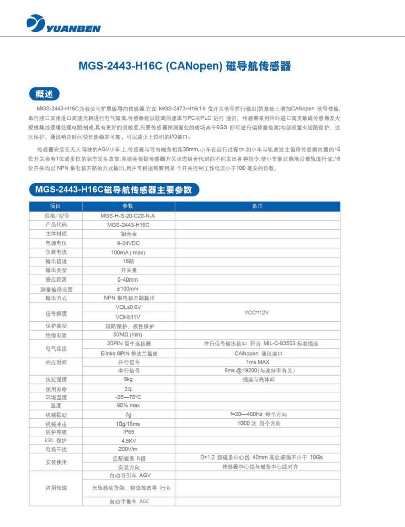 MGS-2443-H16C是上海源本磁電技術有限公司擴展版導向傳威器,它在MGS-2473-H16(16位開關信號并行輸出)的基礎上增加CANopen信號傳輸串行接口采用進口高速光耦進行電氣隔離,傳感器能以較高的速率與PC或PLC進行 通訊。傳感器采用國外進口高靈敏磁傳感器及大規模集成邏輯處理電路制成,具有更好的靈敏度,只要傳感器探測面處的磁場高干6GS即可進行偏移量檢測;內部設置有短路保護 過壓保護,通訊響應時間快性能穩定可靠,可以減少上位機的/0接口。