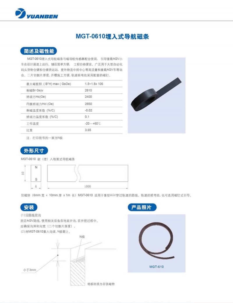MGT-0610埋入式導航磁條與磁導航傳感器配合使用,引導重載AGV小車在設計通道上運行。鋪設簡單方便, 工程價格便宜。廣泛用于大型自動化碼頭貨物倉儲和倉儲貨運站,室外物流中轉中心等高流量和重載AGV車等場合。二片切割片厚度,開槽施工方便,軌道轉彎處采用配套的磁釘。
