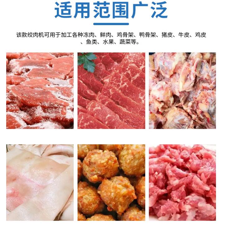 絞肉機用途廣泛,可將塊狀原料肉絞切成顆粒或肉泥,便于和其它輔料混合,以滿足不同肉制品的需要。該機適用于食品加工廠、賓館、飯店、餐廳、團體食堂、學校、部隊等對肉類有加工需求的加工場所。