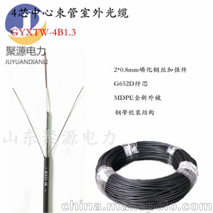 GYXTW 光纜的結構是將 250μm 光纖套入高模量材料制成的松套管中,松套管內填充防水化合物。松套管外用一層雙面涂塑鋼帶(PSP)縱包,鋼帶和松套管之間加阻水材料以保證光纜的緊湊和縱向阻水,兩側放置兩根平行鋼絲后擠制聚乙烯護套成纜。