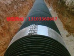 電熔帶連接(見下圖)是通過對鑲嵌在聚乙烯帶內表面的電熱絲加熱,使鋼帶增強聚乙烯螺旋波紋管的波谷間用聚乙烯帶熔融成為整體的連接方法,屬剛性連接。